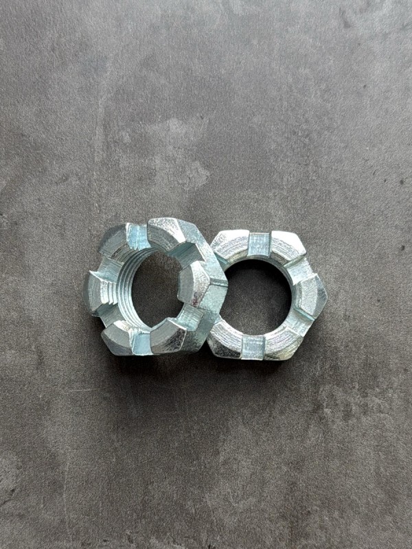 Гайка М24х1,5 корончатая, мелкий шаг резьбы. Гайка российского производства. Артикул: 853514. Применяемость: гайка рулевого пальца КАМАЗ. Диаметр резьбы: 24 мм. Шаг резьбы: 1,5. Высота: 20 мм. Размер "под ключ": 36 мм. Высота от опорной поверхности до основания прорези: 14 мм. Покрытие: цинк.